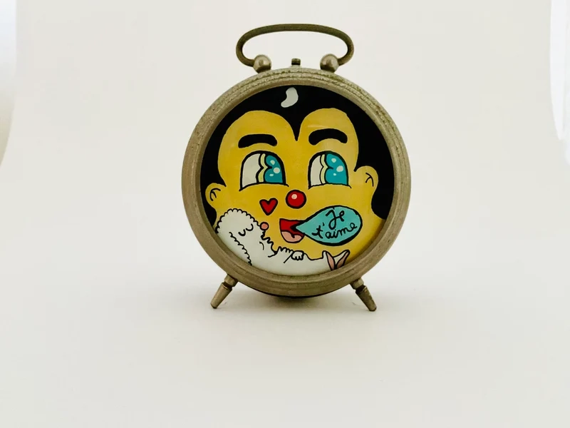 Petit tableau fixé sous-verre sur un support réveil matin vintage. Ne fonctionne pas.
